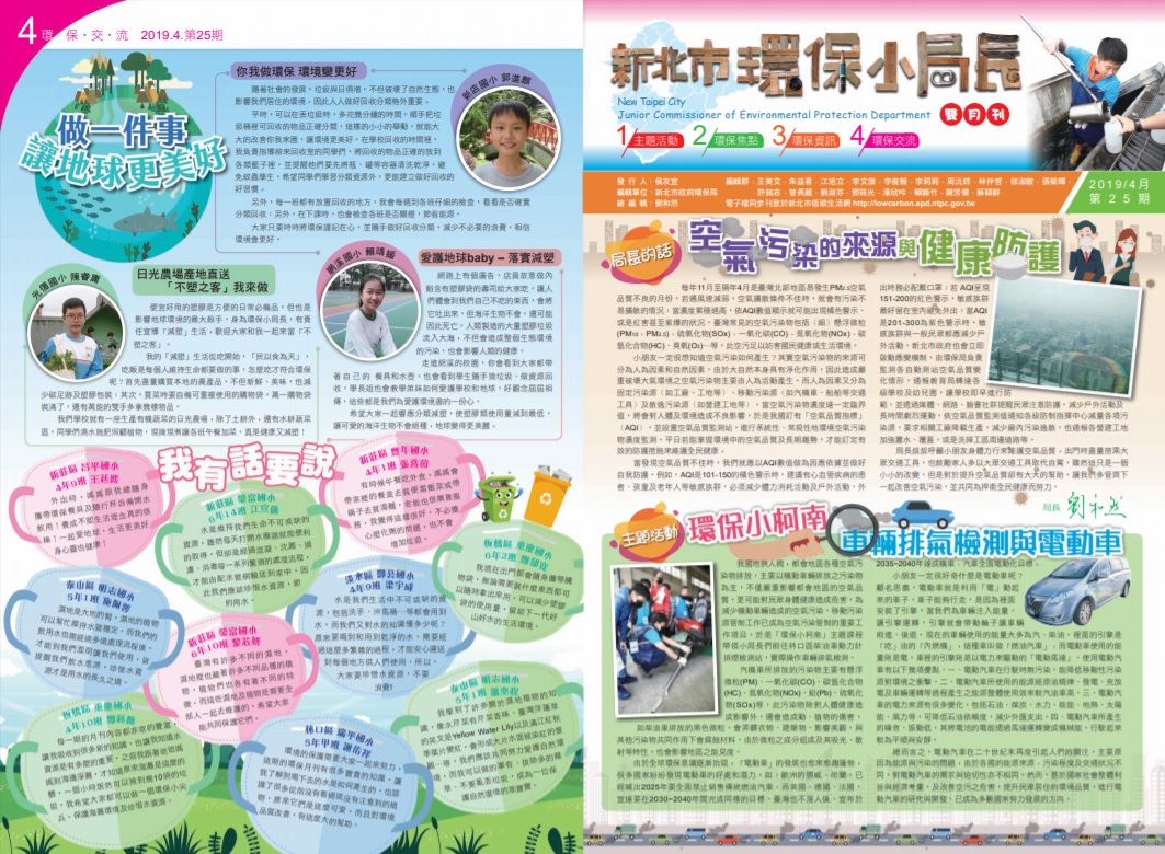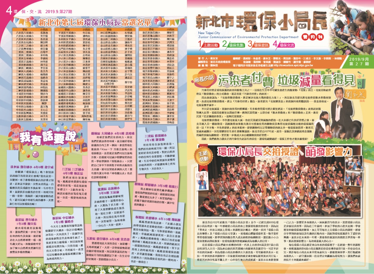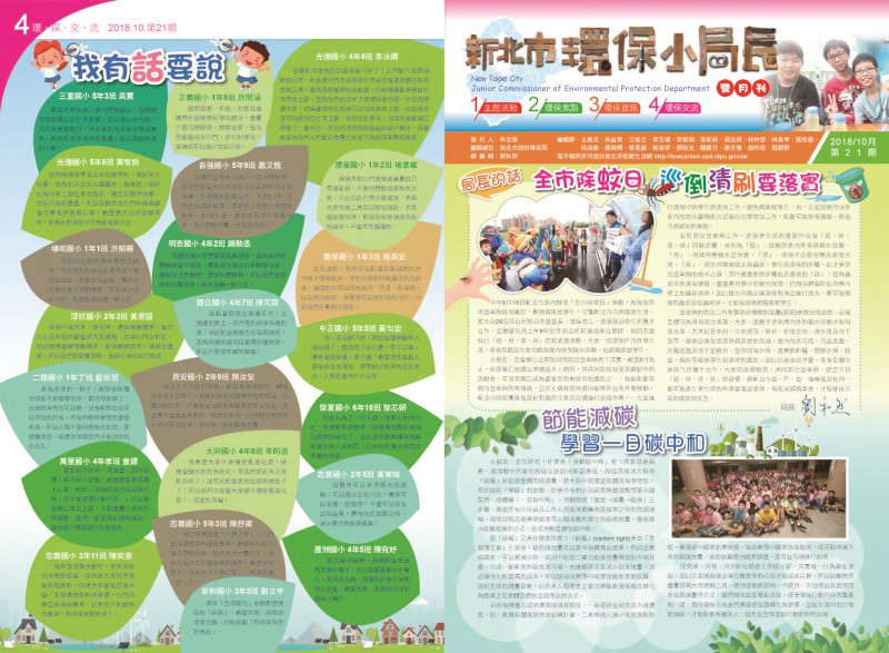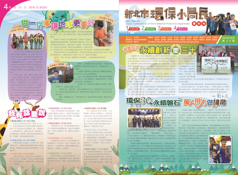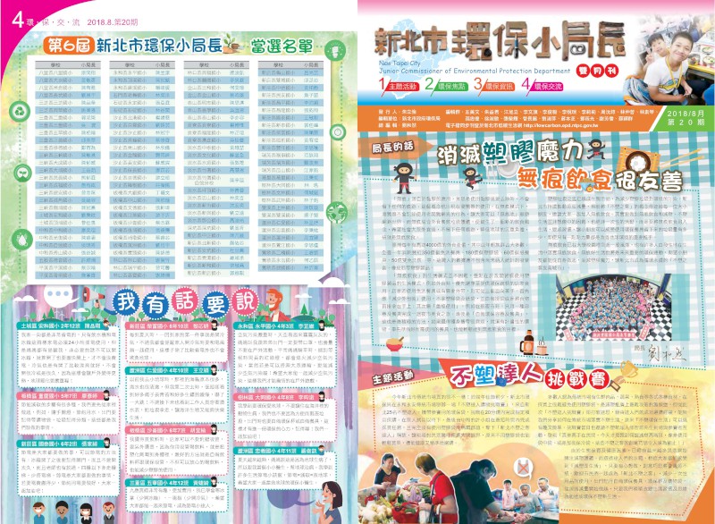 新北市環保局發行「環保小局長雙月刊」,由四個專欄(主題活動、環保焦點、環保資訊及環保交流)組成,報導時下最夯的環保議題及環保小局長們校內、校外的環保行動歷程,讓每一位學生、老師及家長也能共同參與這場難...