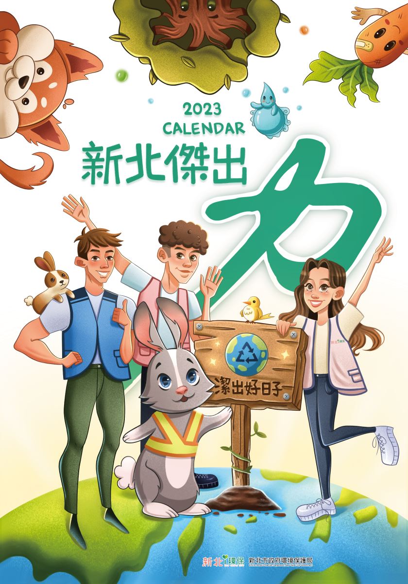 2023「新北傑出力」是環保局推出的第三款形象月曆,由輔仁大學應用美術系方彩欣教授擔任顧問,帶領應用美術系學生林秋彤、鄭甯方及汪靖璇進行創作設計,以卡漫繪畫風格結合實景,融合虛擬與現實,趣味呈現環保業...